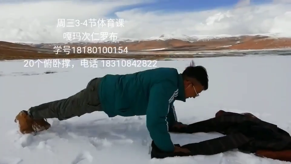 藏族学生嘎玛次仁罗布家住西藏那曲,家乡环境较恶劣,那里海拔将近五千米,高海拔意味着高难度,但他没有放弃。嘎玛说:“家里没什么适合做俯卧撑的地方,附近山上是我常去的地方,常年积雪不化。其实爬到山顶我就已经累的喘不过气了。不过我其实挺开心的,这我是第一次在山上做俯卧撑,不仅完成了参赛任务,得到了锻炼,还看到了美景。”在雪原上认真做起俯卧撑的他让家人拍下了视频,视频中虽有些慢、但几乎不变形的“一起一落”诠释着绝不服输的体育精神,最终,嘎玛获得本次活动的最佳参与奖。