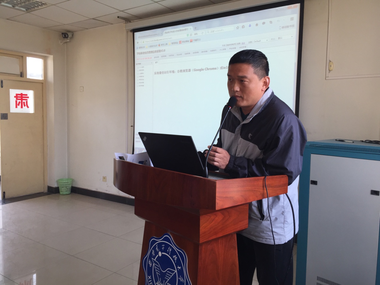 学校体育综合管理信息系统分为网上选课、在线答题考试、在线成绩查询、网上评教、在线体质测试预约等几个部分。本学期对学校体育综合管理信息系统进行了升级,增加了APP及数据采集仪,本次培训内容为:PC端软件的访问及教学、体侧使用方法;APP软件下载、安装及注意事项;APP教学软件的教学、体测使用方法;数据采集仪的使用等。2017年11月7日特邀请西安博信信息科技有限公司经理张小龙来我校为best365网页版登录全体教师进行培训。