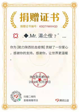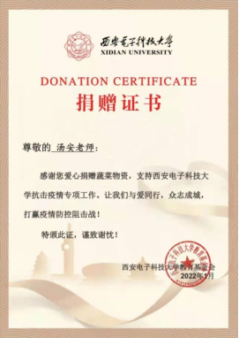 1月3日,best365网页版登录教职工汤安同志个人向学校捐赠了近二吨的蔬菜。当日中午,此批蔬菜已全数安全无损地送达学校,极大并及时补充了学生餐厅的蔬菜供应需求。为感谢他的光荣爱心举动,学校教育基金会和陕西省慈善协会分别向他颁发了证书。