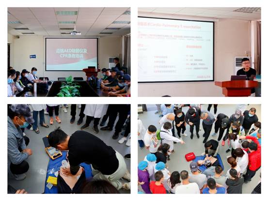 孙泽老师首先用PPT展示讲解了如何把握CPR黄金6分钟,为有需要的人及时有效地实施CPR急救,能够大大提高抢救成功率,并在实践环节再现了讲座中现场急救的步骤和注意事项。教师们在医护人员的指导下分组进行心肺复苏和除颤仪操作练习,气氛紧张有序。