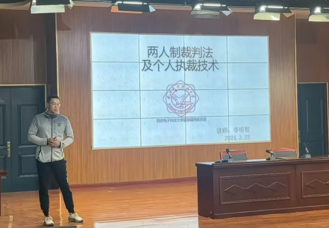 下午时段,李明智老师进行了《裁判法理论及执裁技巧》理论内容的分享,并结合自身执裁经验讲解了裁判法实践过程的方式方法,为便于学员更好理解相关知识,组织进行了裁判手势及裁判法的实践练习,极大提高了裁判员们的临场实操能力和比赛流程的的认知。
