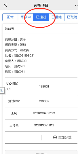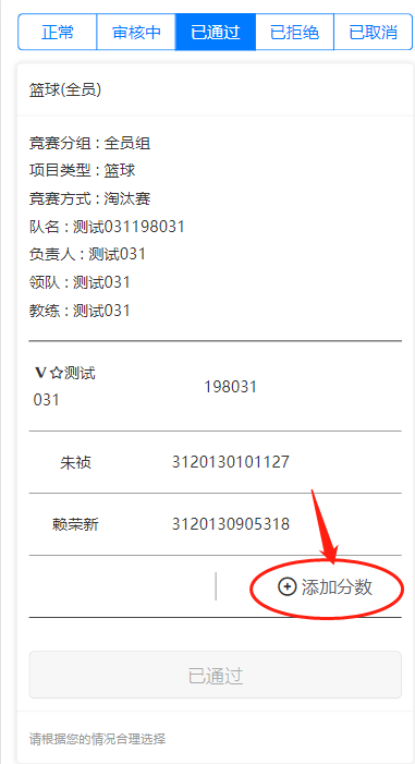 成绩录入同报名方法,进入群体竞赛“自建参赛队”,“已通过”页签,如下: