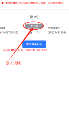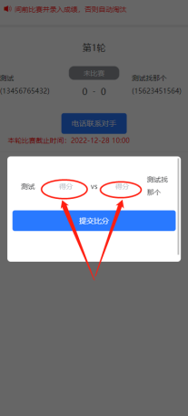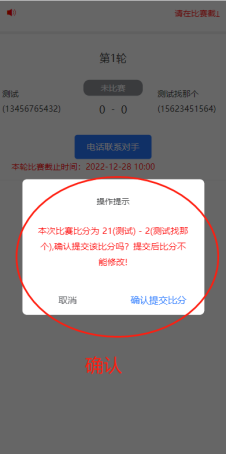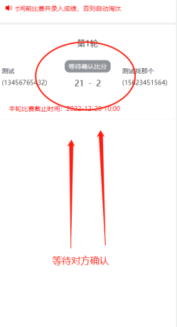 两队比赛后,需将比赛分数录入便于后续赛程的顺利进行。比赛双方任意一方均可录入比赛,录入成绩后显示“等待比分确认”。另一方需要进入“确认分数”,确认后根据比分大小晋级或者淘汰。