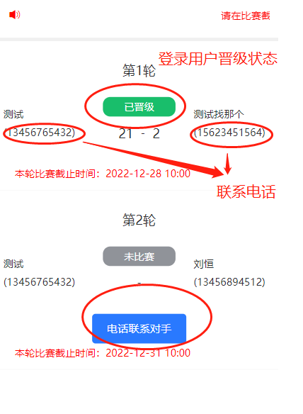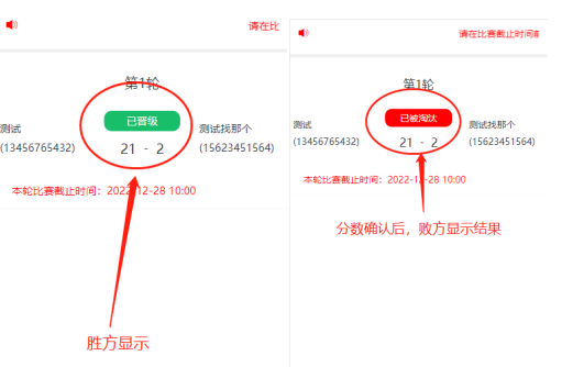 轮空晋级属于正常情况。如果一方未及时确认,请联系对方确认比赛结果,否则影响晋级。未录入成绩在每轮比赛时间截止后,系统将双方均按淘汰处理。一方录入成绩,另一方确认成绩后,各自显示情况如下: