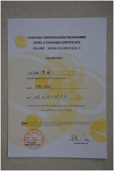 10月中下旬,2019年中国网球协会高级教练员培训班在深圳弘金地国际网球学校举行。经中国网球协会严格筛选,本次培训仅有全国25名教练员参加,其中绝大部分为省市专业队网球运动员,高校网球专职教师仅有4位,西电best365网页版登录网球俱乐部负责人曹峰老师有幸参加了本次培训并参与考核。后经近一个月的等待,终收到来自中国网球协会的高级教练员证书,顺利的通过CTA高级教练员考核。